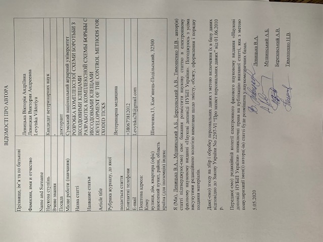 Levytska V. A. Mushynskyi A. B., Berezovskyi A. V. (2019). Monitorynh transmisyvnykh zakhvoriuvan shcho peredaiutsia iksodovymy klishchamy v zakhidnykh oblastiakh Ukrainy. [Monitoring of transmissible diseases transmitted by Ixodes mites in the western regions of Ukraine.]. Naukovyi visnyk LNUVMB imeni S.Z. Gzhytskoho. T.21, № 96. S. 14-18.