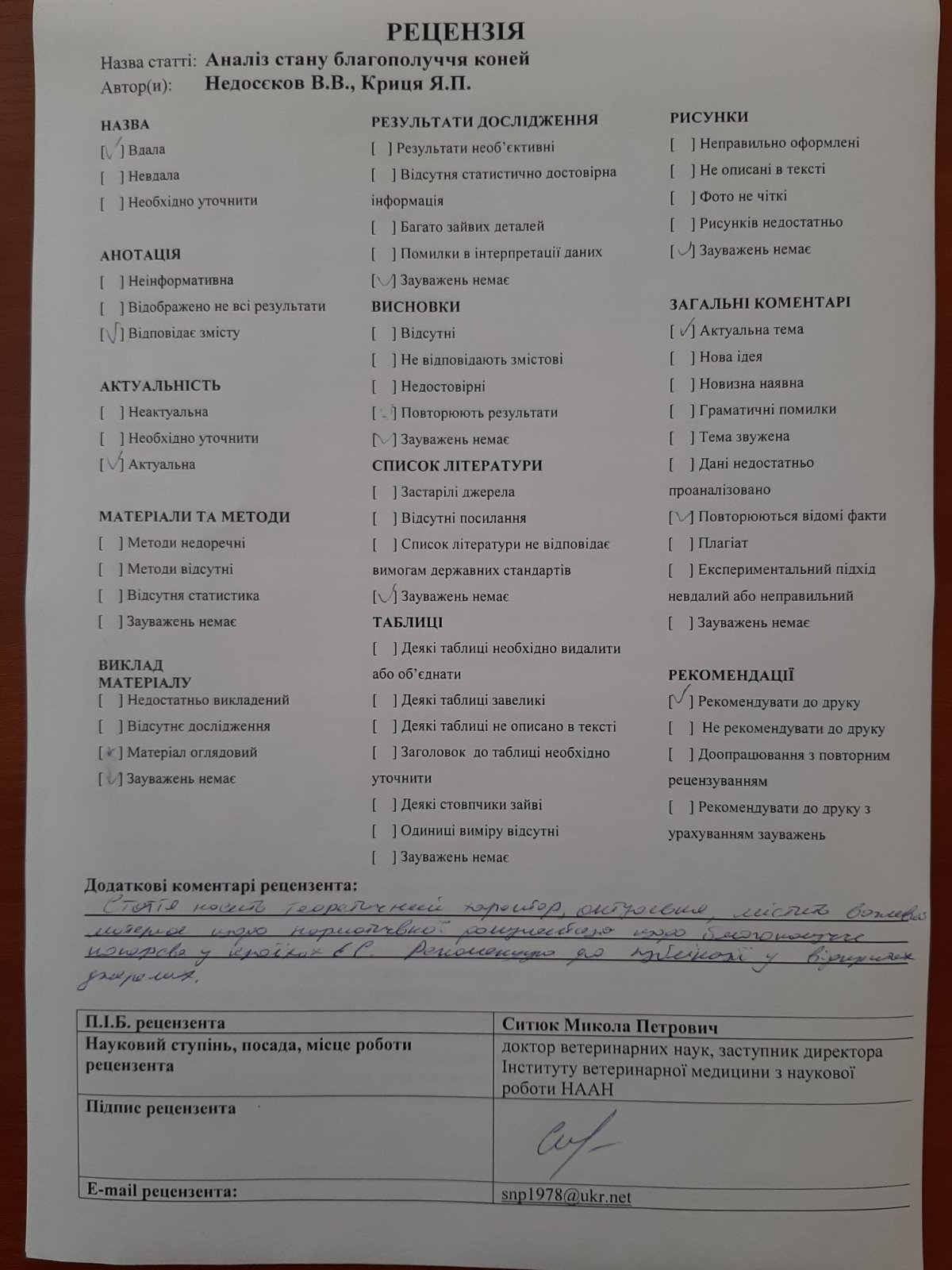 Undoubtedly, in combination with the welfare of horses, it is important to develop an algorithm for biosecurity in the horses management with an emphasis on the epizootology of diseases, vaccination conditions, disinfection and analysis of critical points of admission to animals, which should be the basis for the development of the National Standard for Welfare and Biosecurity at the level of horse farms in Ukraine.