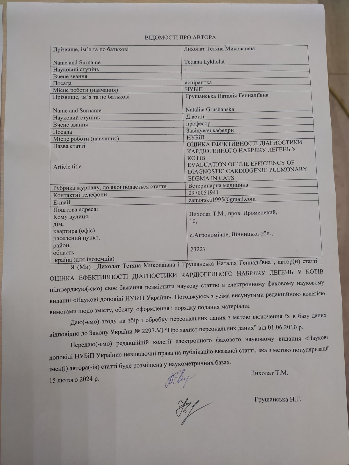 Lyholat T., Grushanska N., Sharandak P., Kostenko V., Rozumniuk A. Ultrasound and x-ray examination of pulmonary edema of a domestic cat. ScienceRise: Biological Science, https://doi.org/10.15587/2519-8025.2023.283679 Published on 06/30/2023. (2(35), 25–34.