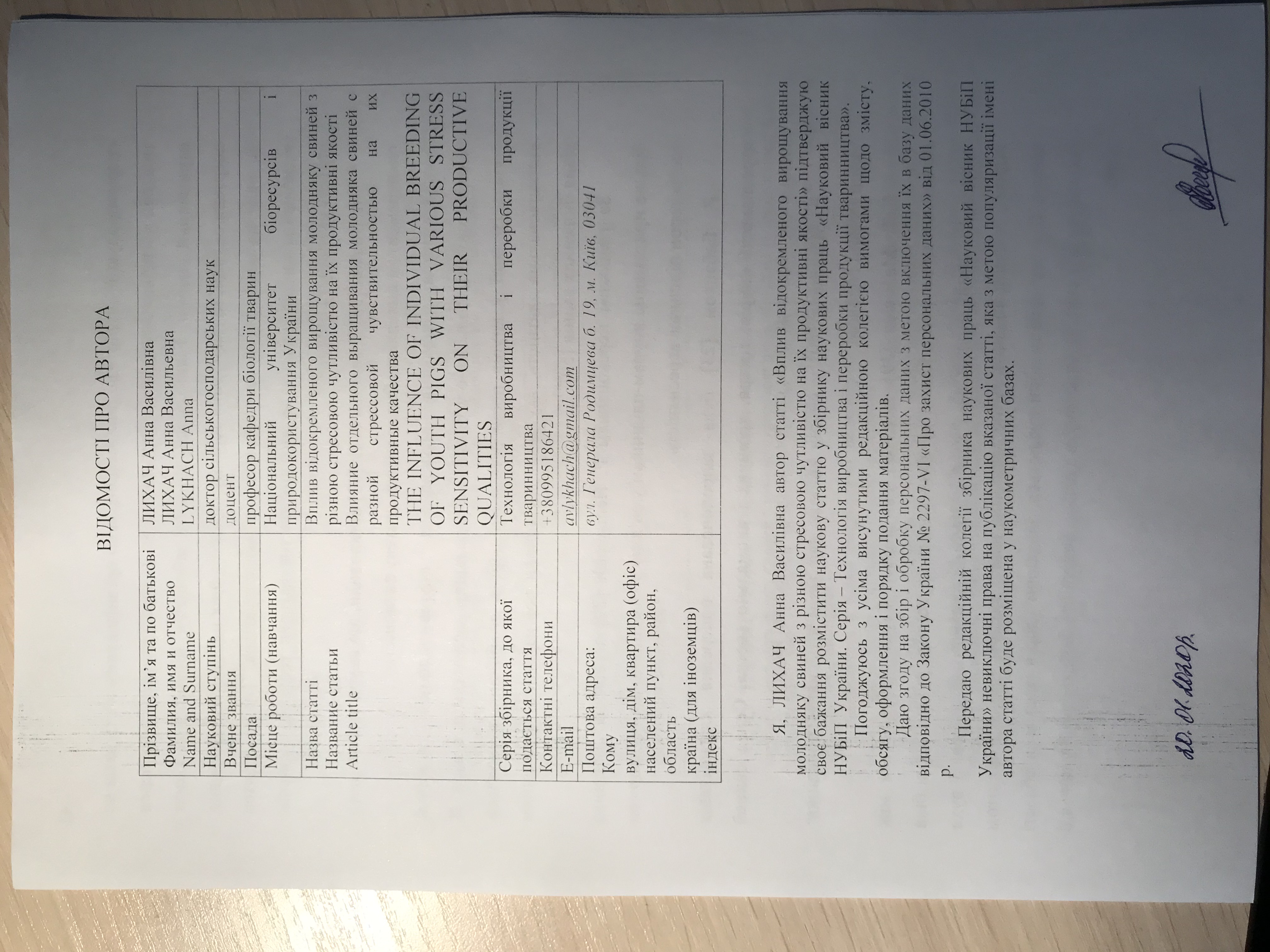 Lykhach, V. Ya. (2016). Obgruntuvannia, rozrobka ta vprovadzhennia intensyvno-tekhnolohichnykh rishen u svynarstvi (monohrafiia) [Substantiation, development and implementation of intensive technological solutions in pig production (Monograph)]. Mykolaiv : MNAU. 227. (In Ukrainian).