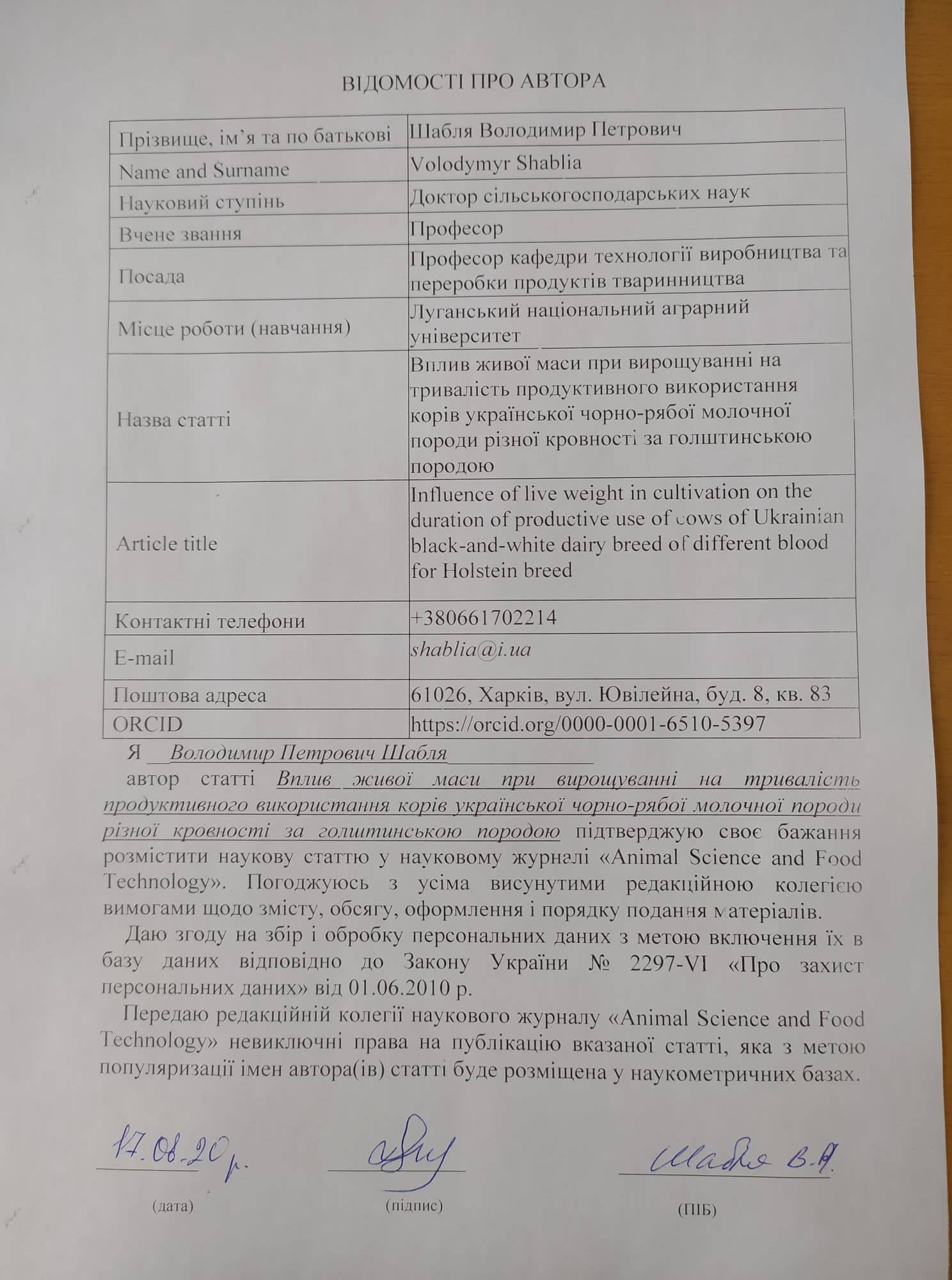 Тривалість продуктивного використання є досить складною інтегральною ознакою і визначається як генетичними, так і паратиповими факторами. я ознака має забезпечити максимальну молочну продуктивність тварин, економічну ефективність молочних ферм і в цілому обмежити вартість вирощування і утримання корів. Дослідження проводили у виробничих умовах дослідних господарств державних підприємств «Кутузівка», Харківського району, Харківської області на телицях української чорно-рябої молочної породи (4038 гол.). Вивчали тривалість продуктивного використання корів, розділених на градації за умовною кровністю за голштинською породою, залежно від живої маси у контрольні вікові періоди вирощування (за народження, у 6, 12 та 18 місяців). Максимальне значення тривалості продуктивного використання зафіксоване у групі корів із часткою умовної кровності за голштинською породою до 30 % включно (середня тривалість продуктивного використання - 2,77 лактації). Найвищий показник тривалості продуктивного використання досліджених тварин становив 4,09 лактації. Серед корів із часткою умовної кровності за голштинською породою до 30 % найдовше продукували ті, що народилися із живою масою більше 40 кг (4,09 лактацій), у 6-місячному віці важили 100-149 кг, у 12-місячному – 200-249 кг, у 18-місячному – 350-399 кг. Серед тварин з часткою умовної кровності 31-60 % найдовше продукували ті, що мали живу масу у віці 6 місяців 155-190 кг (3,17 лактацій), у 12 – 250-299 кг (2,98 лактацій), у 18 – 350-399 кг (3,06 лактацій). У найчисельнішої градації із часткою умовної кровності за голштинською породою 61-90 % найбільш тривалим продуктивним використанням вирізнялися тварини, народжені із живою масою 30-39 кг (2,12 лактації), у 6-місячному віці важили більше 200 кг (3,29 лактації), у 12-місячному – 300-349 кг (3,40 лактації), у 18-місячному – 400-449 кг (2,82 лактації). Середні показники тривалості продуктивного використання корів цієї градації досить низькі – в межах 2,82-3,29 лактацій. Найвищий ступінь впливу на тривалість продуктивного використання у цій градації тварин зафіксовано по фактору живої маси у 6-місячному віці (η2=10,8). Порівняльною оцінкою градації корів з часткою умовної кровності за голштинською породою 91 % і більше встановлено, що найбільш тривалим продуктивним використанням характеризувалися корови, що мали живу масу за народження 30-39 кг (1,93 лактації), у 6 місяців - 155-199 кг (2,73 лактації), у 12 – 250-299 кг (2,87 лактації) і у 18 – 350-399 кг (2,62 лактації). Ступінь впливу живої маси у цьому віці на тривалість продуктивного використання корів незначна, окрім живої маси у 6-місячному віці (η2=11,8).