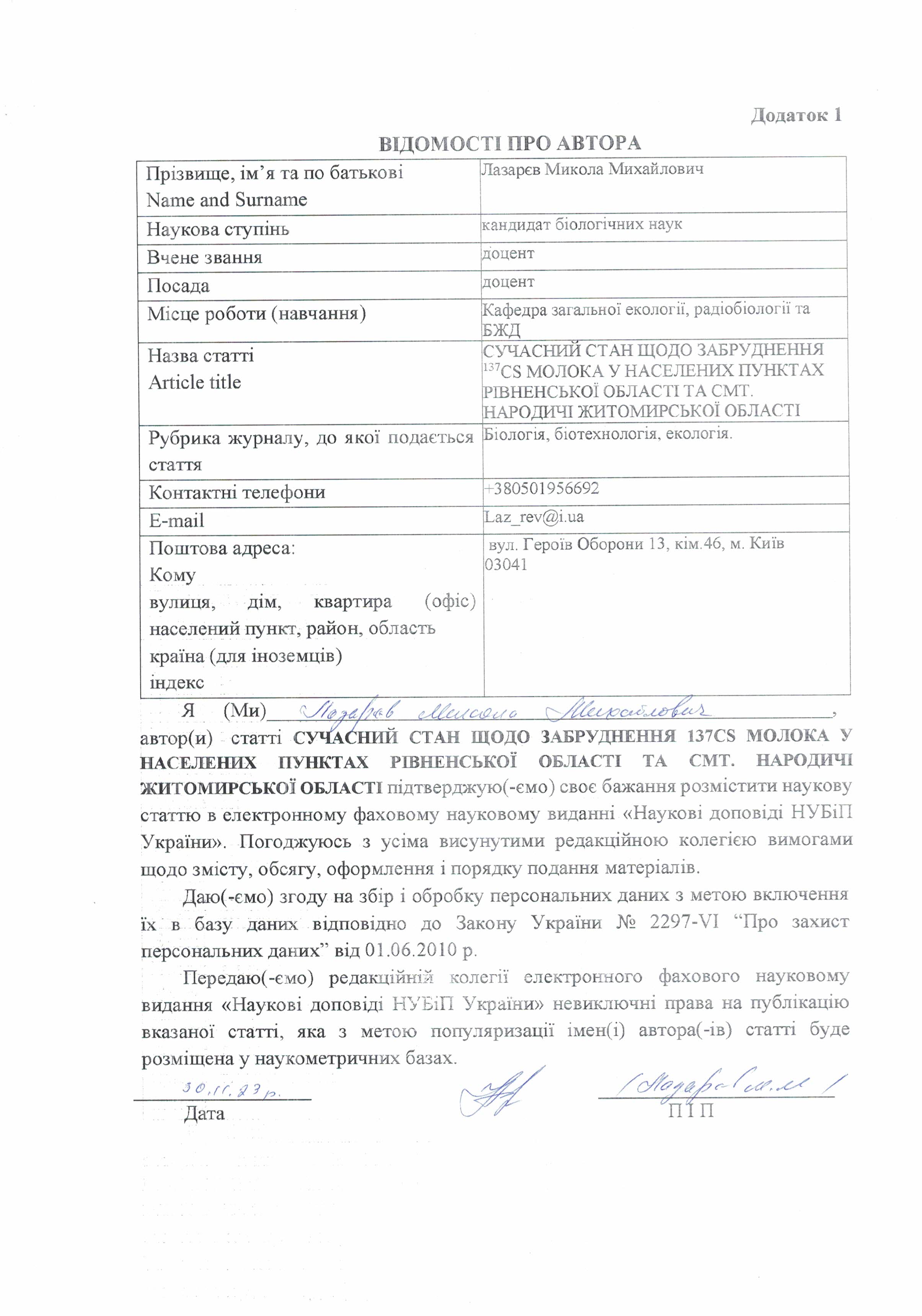 Levchuk S. E., Lazarev M. M., Pavliuchenko V. V. (2016). Current state of 137Cs contamination of cow milk in the northern regions of Ukraine. Physics and Atomic Energy, Т. 17 № 1, Pages 69–75. https://doi.org/10.15407/jnpae2016.01.069
