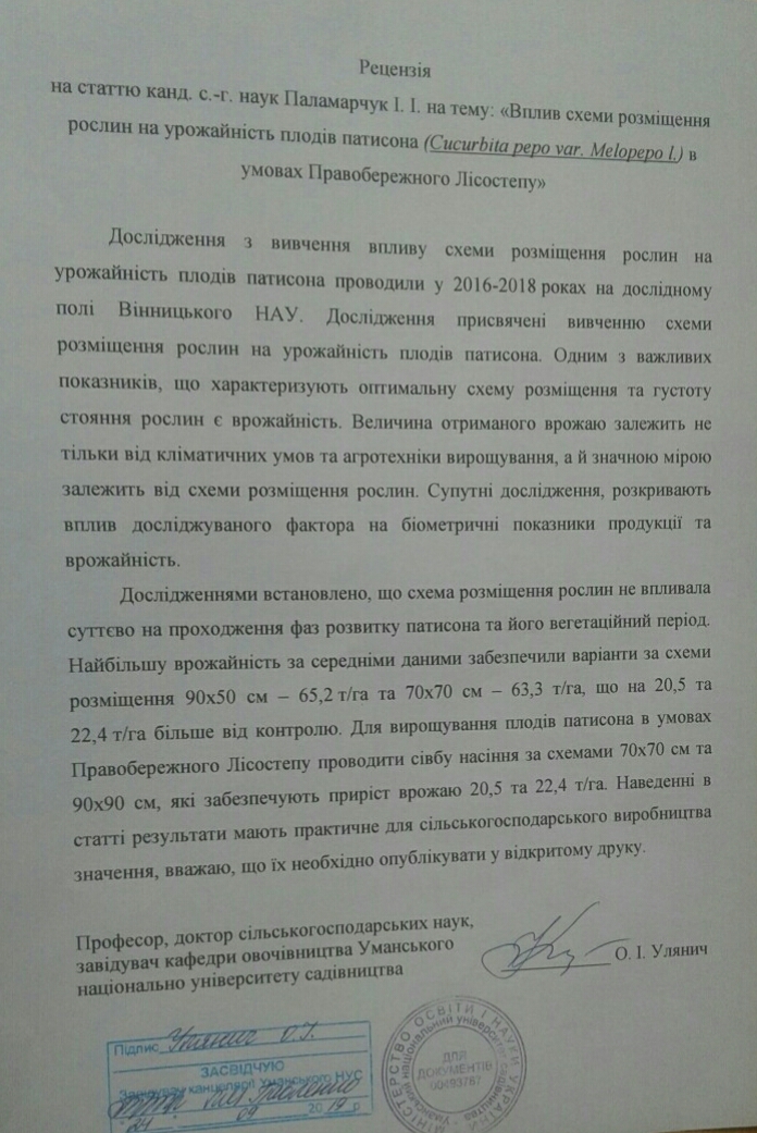 Palamarchuk I. I. (2013) Vpliv shemi rozmischennya roslin na urozhaynist plodiv kabachka v umovah Lisostepu Pravoberezhnogo [Influence of the scheme of plant placement on the yield of zucchini fruits in the conditions of the Forest Steppe of the Right Bank]. Visnik Sumskogo NAU – Bulletin of Sumy NAU. Vip. 3 (25). Sumi. 141–143. [in Ukrainian].