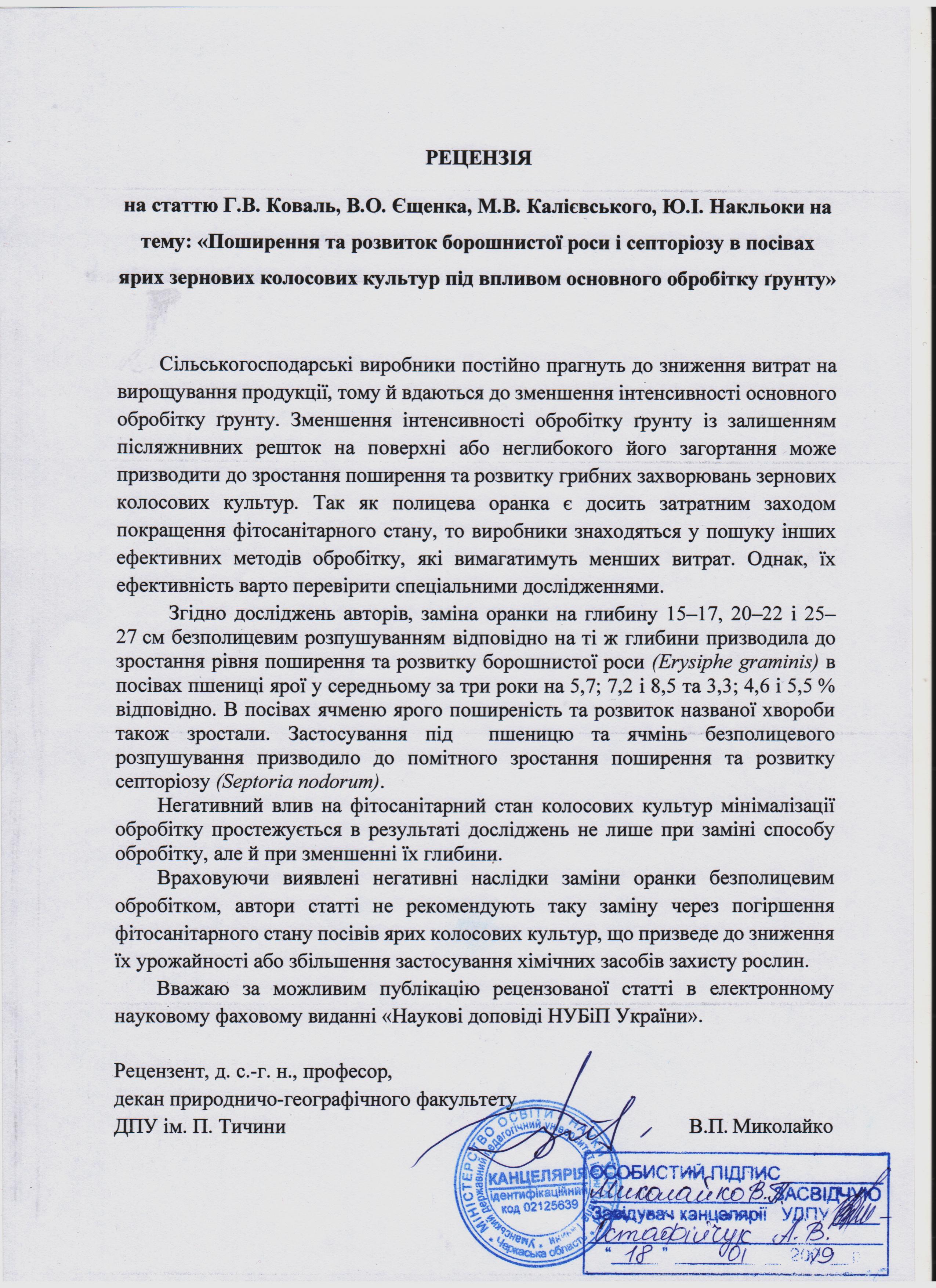 Поширення та розвиток борошнистої роси і септоріозу в посівах зернових колосових культур під впливом основного обробітку грунту