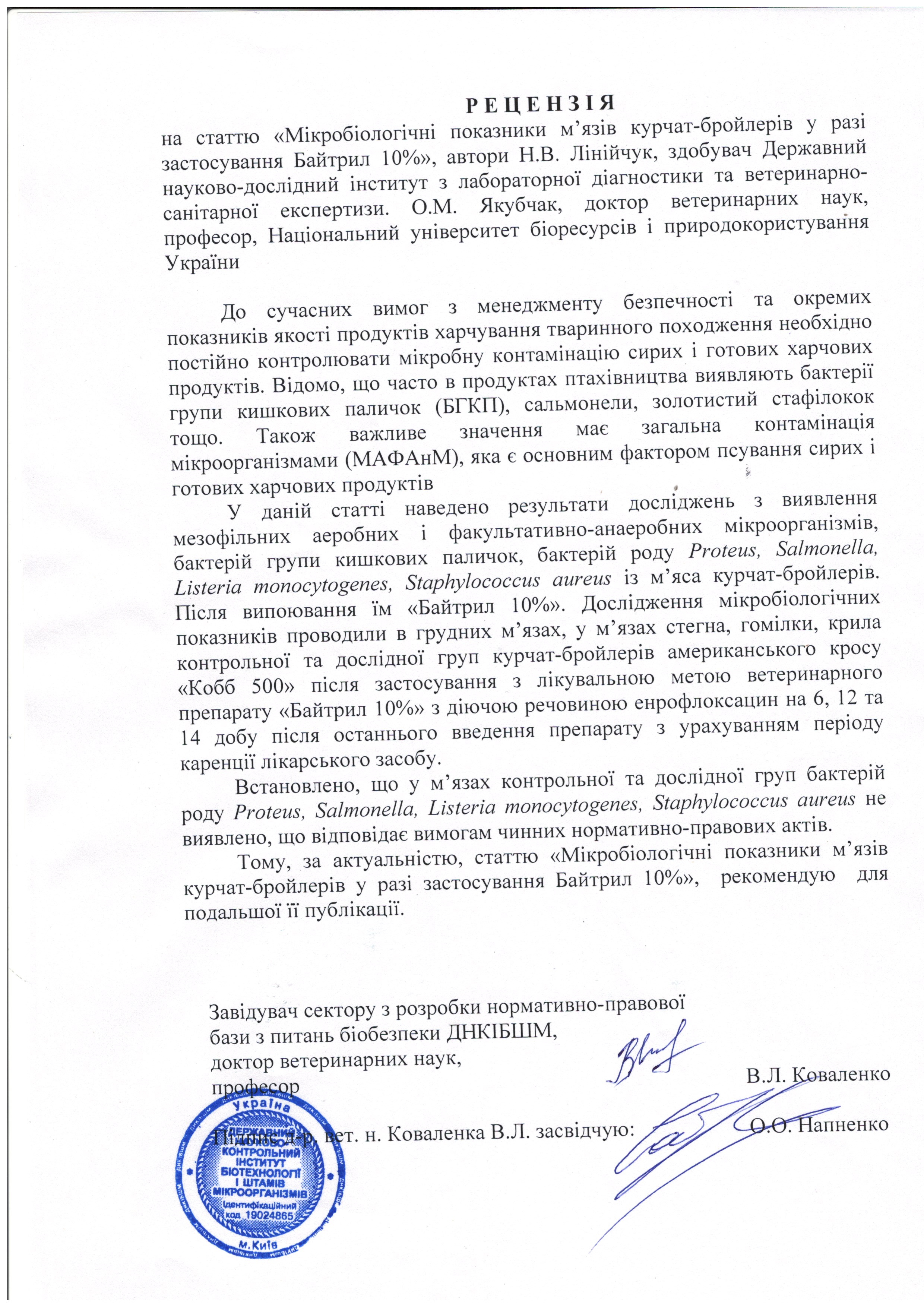 Liniichuk N. V., Yakubchak O. M., Halka I. V. (2017) Osoblyvosti nakopychennia enrofloksatsynu v orhanizmi kurchat-broileriv [Асcumulation specifies of enrofloxacin in organism of broiler chickens]. Naukovyi visnyk Natsionalnoho universytetu bioresursiv i pryrodokorystuvannia Ukrainy. Ser.: Veterynarna medytsyna, yakist i bezpeka produktsii tvarynnytstva, 273, 115 - 122 (in Ukrainian).
