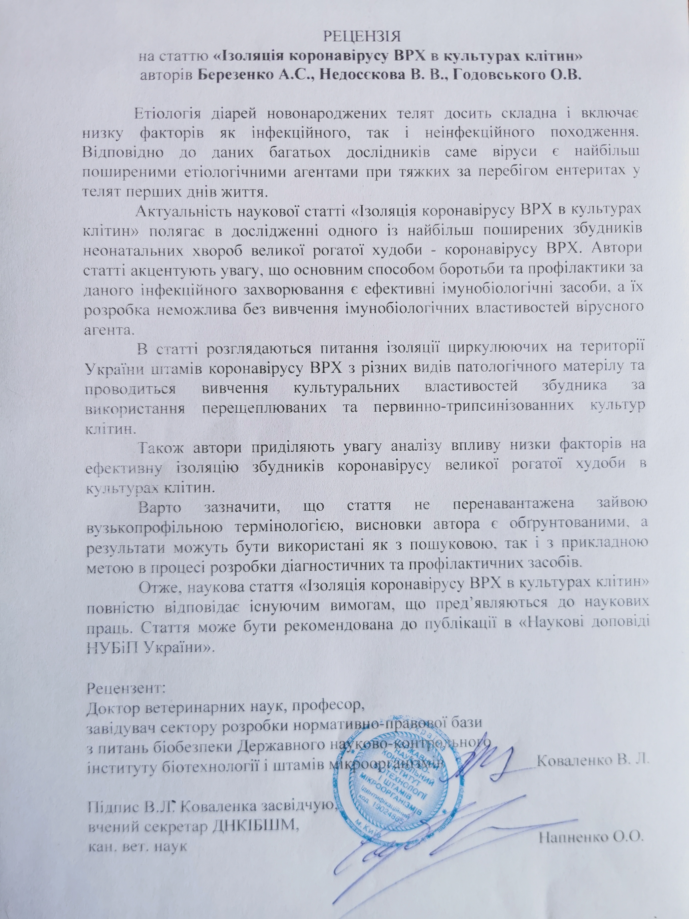 Одним із найбільш поширених у світі вірусів, що спричиняє захворювання у великої рогатої худоби є коронавірус ВРХ (BCoV). Цей вірус є збудником інфекції респіраторного та шлунково-кишкового тракту в новонароджених телят, що призводить до значних економічних втрат, як у молочному, так і в м’ясному напрямах тваринництва. З огляду на складну епізоотичну ситуацію щодо коронавірусів у світі та часткову антигенну спорідненість ВCoV з коронавірусами інших видів тварин та людини, вкрай важливим і актуальним стає виділення нових штамів коронавірусів, їх ідентифікація та оптимізація умов культивування.