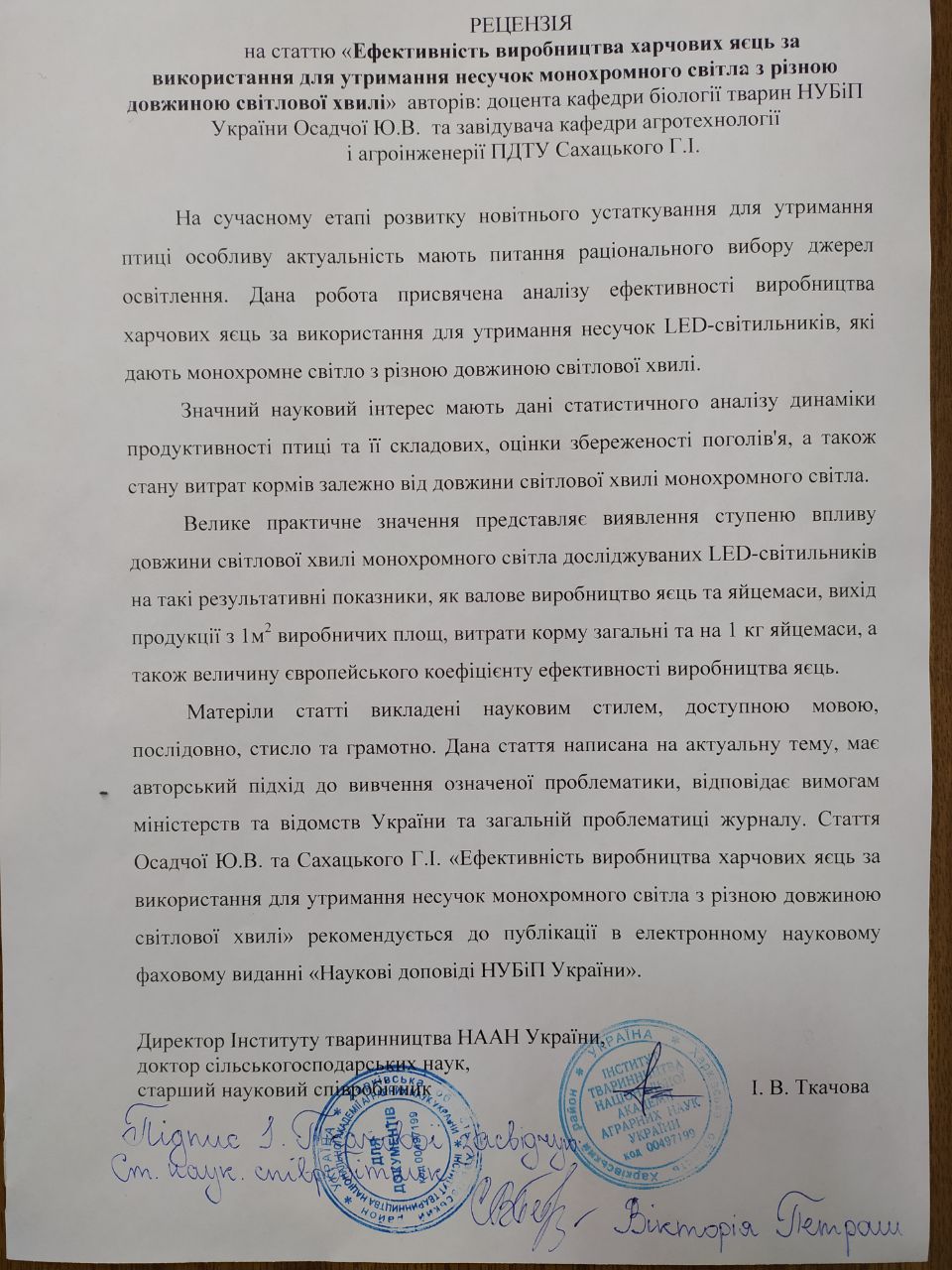 Досліджено ефективність виробництва харчових яєць за використання для утримання курей-несучок монохромного світла з різною довжиною світлової хвилі. Виявлено, що зменшення довжини світлової хвилі від 653 до 632 нм, тобто зміна кольору світла з червоного до помаранчевого, не призводить до значного зниження збереженості курей та маси їх яєць, однак супроводжується зниженням несучості, що спричиняє зниження виходу яйцемаси на початкову несучку, у результаті європейський коефіцієнт ефективності виробництва яєць знижується на 1,0 од. Зменшення довжини хвилі світла до 603 нм, тобто до жовтого кольору, призводить до істотного зниження збереженості курей і їх несучості за підвищення витрат корму на виробництво 1 кг яйцемаси, що спричиняє зниження європейського коефіцієнту виробництва яєць на 2,6 од. Подальше зменшення довжини хвилі світла до 458 нм, тобто до блакитного кольору, супроводжується наростаючим зниженням збереженості поголів'я курей та їх несучості за підвищення витрат корму на виробництво 1 кг яйцемаси, що в кінцевому підсумку призводить до зниження європейського коефіцієнту ефективності виробництва харчових яєць на 3,8 од.Посилання